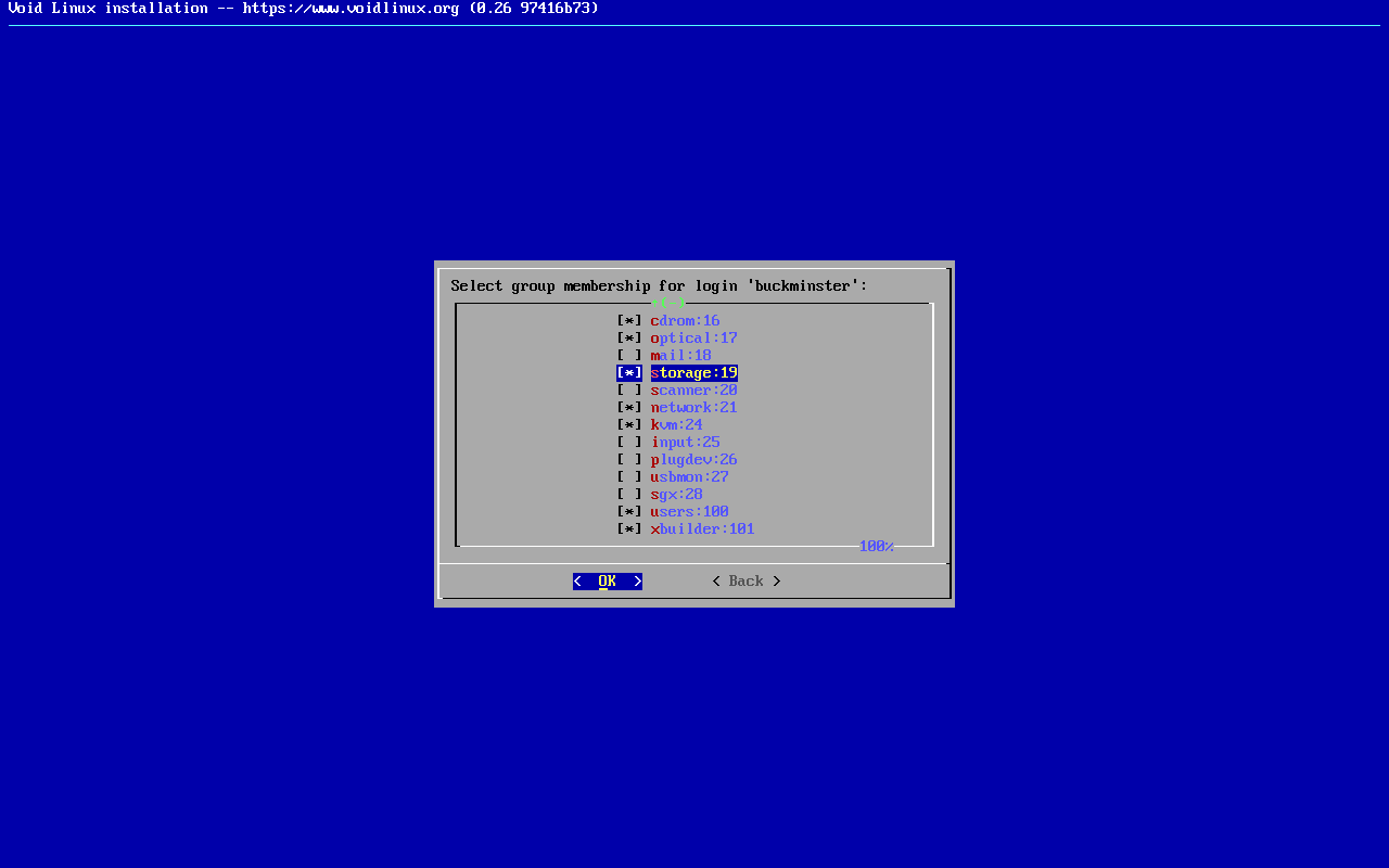Eu acrescentei, além dos padrões, dois grupos: storage (é utilizado para conceder aos usuários