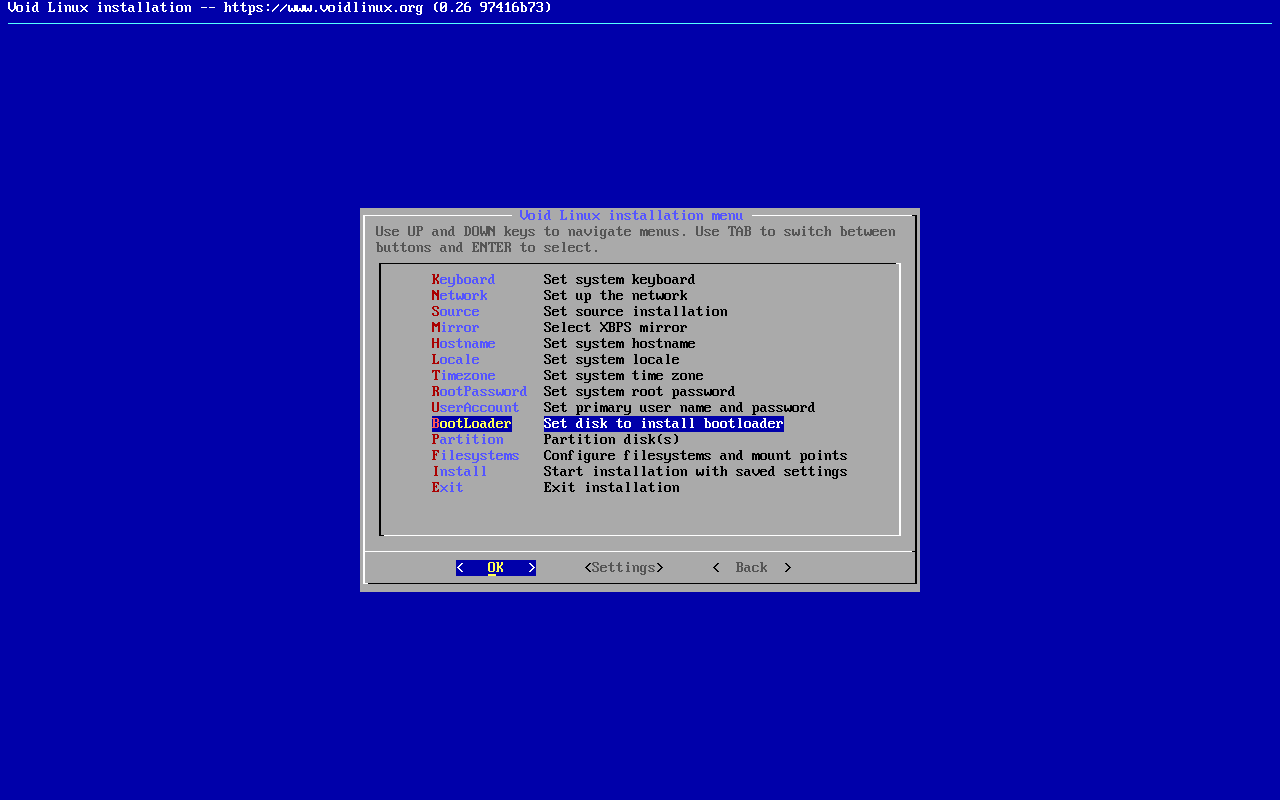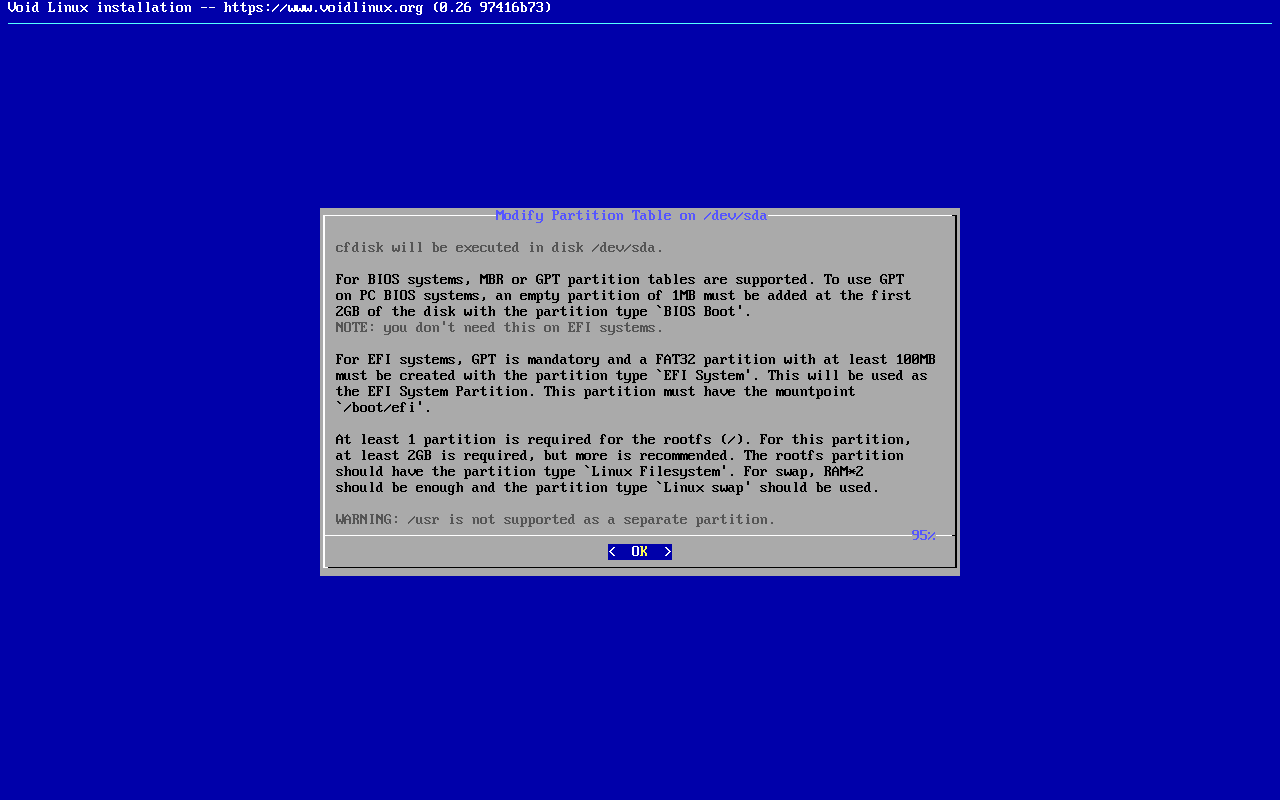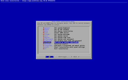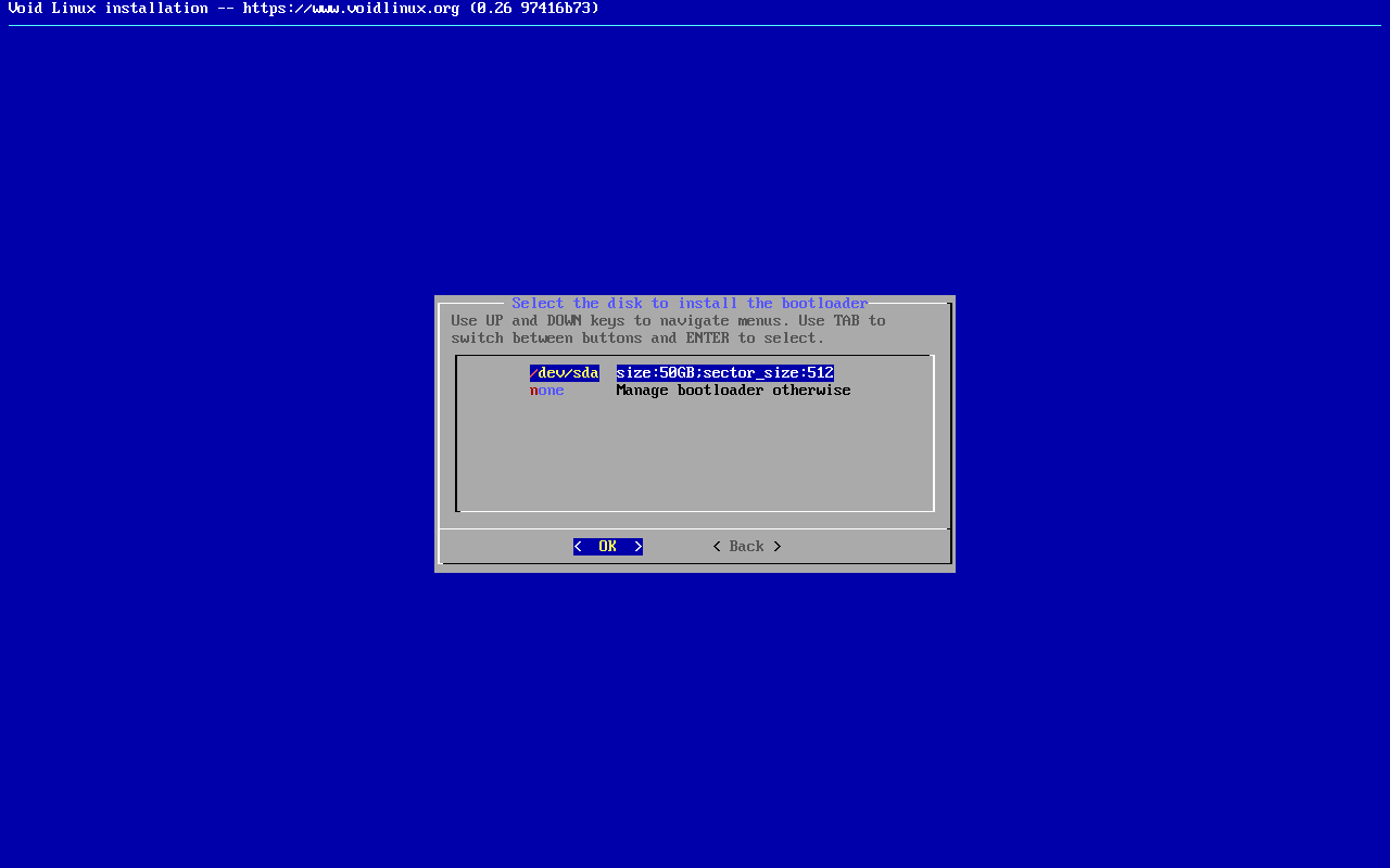 No meu caso deixei /dev/sda porque é nesse disco onde pretendo instalar o Void Linux e é nesse disco onde o GRUB deve ser instalado, como veremos nas próximas telas.