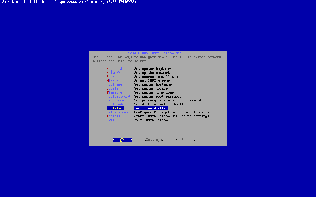Lembrando que, caso estiver em dúvida em alguma etapa da instalação e quiser voltar ao menu sem alterar nada, vá digitando "esc" até retornar ao menu ou use a opção "Back".
