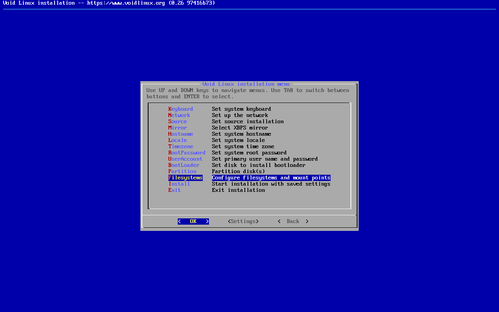 Depois da primeira vez, leva em torno de 15 a 20 minutos para instalar o Void, mesmo que você faça um particionamento complicado.