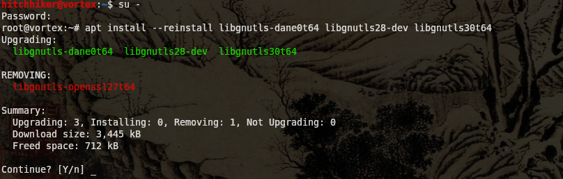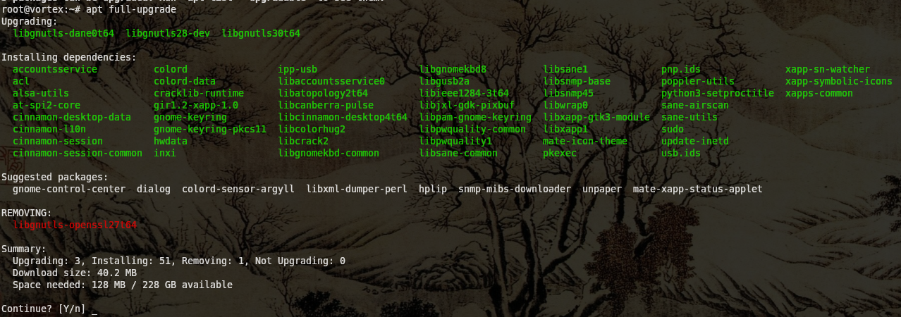 Ontem à noite me deparei com uma situação que até agora não entendi o motivo. Sempre que vou desligar o notebook, rodo um 'apt update' e, caso tenha algo, um 'apt upgrade'. Vez ou outra preciso rodar um 'apt full-upgrade' para remover algum pacote que será substituido por outro, como aconteceu ontem onde o libgnutls-openssl27t64 seria substituido pelos pacotes libgnutls-dane0t64, libgnutls28-dev e libgnutls30t64.