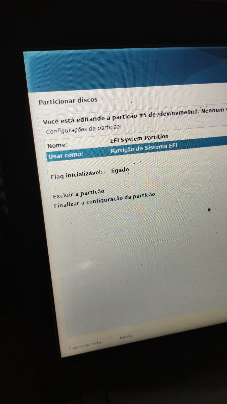 Daí na imagem você tem de selecionar a partição EFI do Windows para usar como partição EFI do Debian e depois selecionar a opção "Finalizar a configuração da partição" e clicar no botão "Continuar".