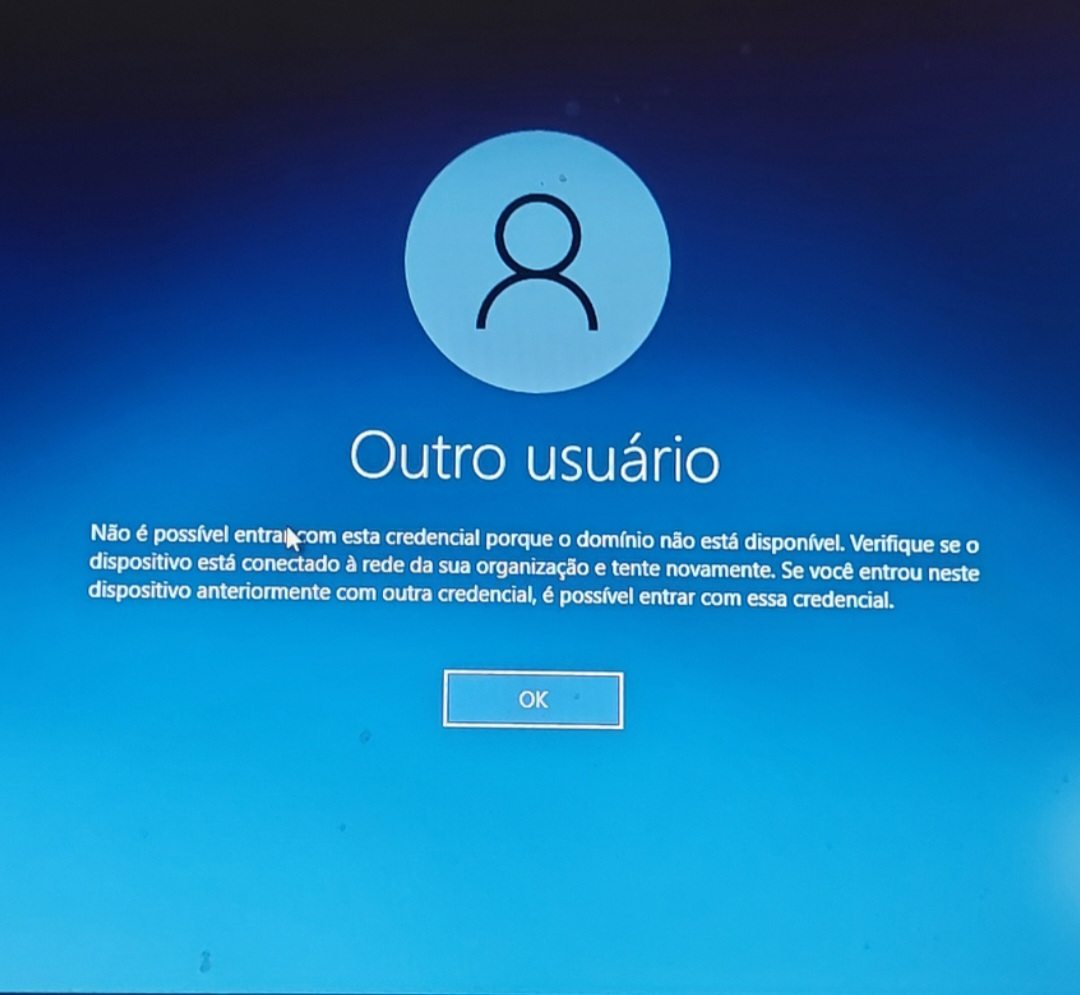 Mensagem ao logar no Windows 10 e 11. Não é possível entrar com esta credencial porque o domínio não está disponível. Verifique se o dispositivo está conectado à rede da sua organização e tente novamente. Se você entrou neste dispositivo anteriormente com outra credencial, é possível entrar com essa credencial.