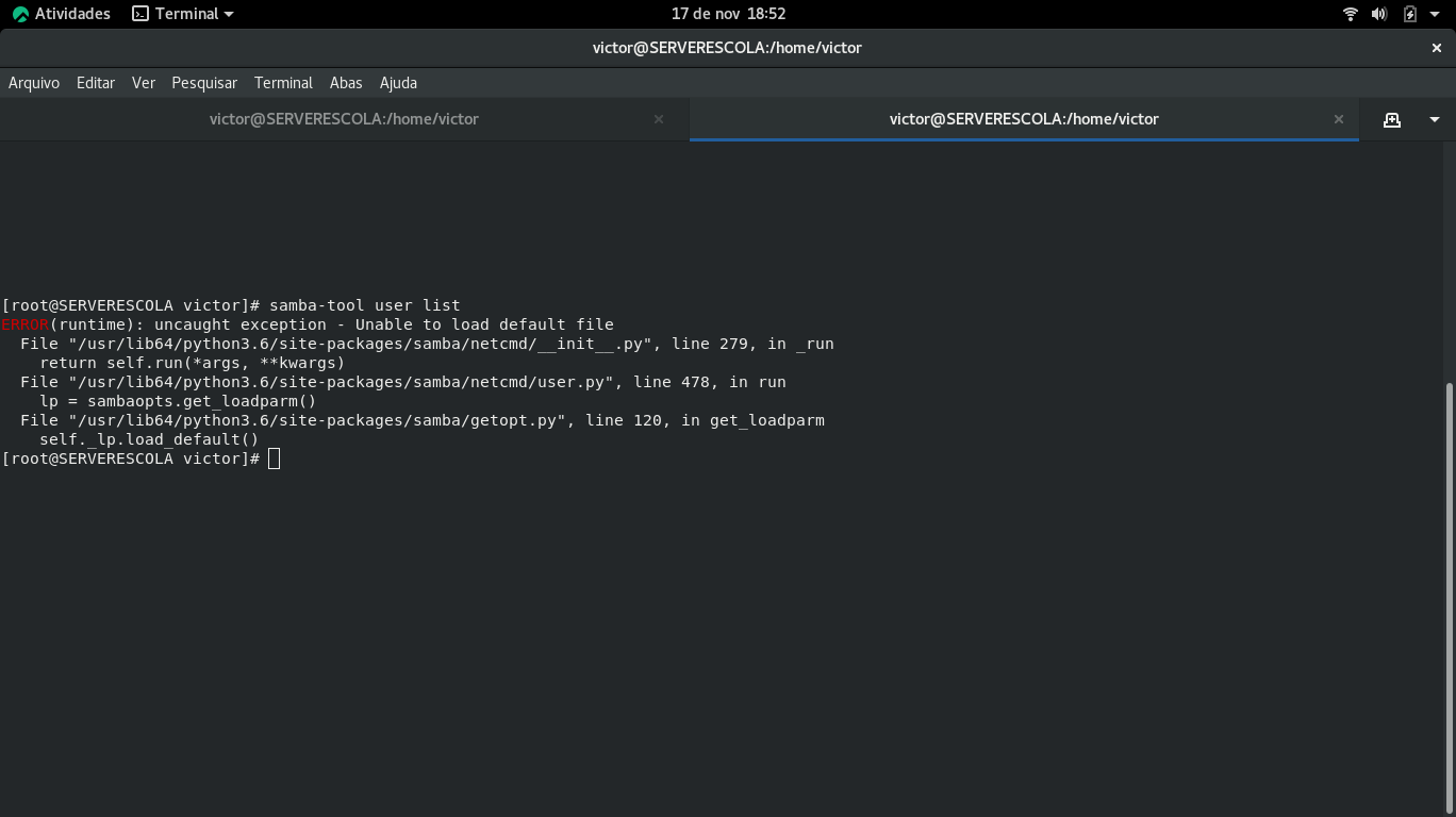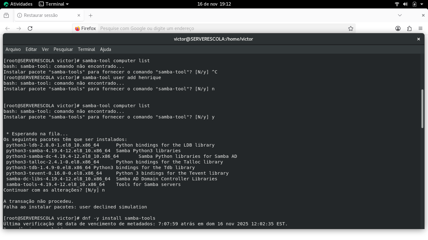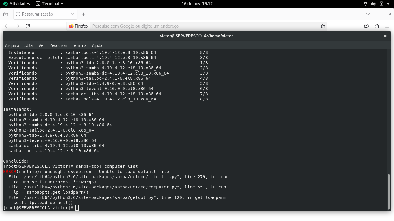 Lembrando por fim que o comando samba-tool ainda não funciona, como mostra o print e comandos de saida aqui enviados. Gostaria de entender essa falha com samba-tool.